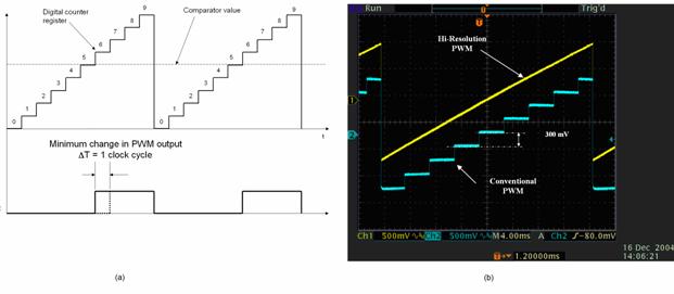 圖 3. 標準 PWM 方案圖,以及高分辨率PWM 與傳統(tǒng)PWM 的示波器圖比較