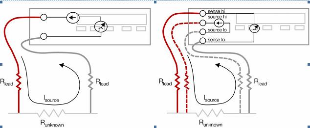 源端引線中的串聯(lián)電阻不影響電流流動。測量/傳感引線幾乎沒有電流流動,因為儀表的輸入阻抗很高。這意味著測量引線中沒有I x R電壓下跌。因此,您只需測量由于流經(jīng)的源電流而在未知電阻器中產(chǎn)生的電壓下跌。