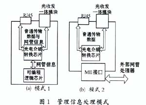收發(fā)器網(wǎng)管功能的實(shí)現(xiàn)有兩種方式:一種是在收發(fā)器電路板上配置網(wǎng)絡(luò)管理信息處理器——可編程邏輯芯片來處理網(wǎng)管信息,該芯片利用OEMC上的雙向管理指令接口(Managenent Data Input/Output,MDIO)、管理數(shù)據(jù)同步時(shí)鐘輸入接口(ManagenentData Clock,MDC)及被管理信息輸入/輸出管腳等接口來獲取管理信息,管理信息與網(wǎng)路上的普通數(shù)據(jù)共用數(shù)據(jù)通道,如圖1(a)所示。第二種方式如圖1(b)所示,收發(fā)器上沒有管理信息處理器,收發(fā)器外部的網(wǎng)絡(luò)管理者通過MII接口獲取管理信息??梢姡芯W(wǎng)管功能的收發(fā)器,其元器件種類及數(shù)量遠(yuǎn)遠(yuǎn)多于無網(wǎng)管收發(fā)器,相應(yīng)地,其布線復(fù)雜,開發(fā)周期長(zhǎng)。