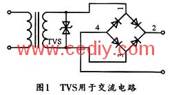 圖1所示是一個(gè)雙向TVS在交流電路中的應(yīng)用電路。應(yīng)用TVS可以有效地抑制電網(wǎng)帶來(lái)的過(guò)載脈沖,從而起到保護(hù)整流橋及負(fù)載中所有元器件的作用。圖1中的TVS箝位電壓應(yīng)不大于電路的最大允許電壓。