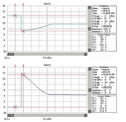 由于RM、RB、RL均非常低,啟動(dòng)電流非常大。例如用12V、45Ah的蓄電池啟動(dòng)安裝1.9升柴油機(jī)的汽車,蓄電池的電壓在啟動(dòng)瞬間由12.6V降到約3.6V!啟動(dòng)過(guò)程的蓄電池電壓波形如圖1;啟動(dòng)瞬時(shí)的電流達(dá)550A,約為蓄電池的12C的放電率!啟動(dòng)過(guò)程的蓄電池電流波形如圖2,(電流傳感器的電流/電壓變換比率:100A/V)。盡管車用蓄電池是啟動(dòng)專用蓄電池,可以高倍率放電,但在圖1中可以看出,10倍以上的高倍率放電時(shí)的蓄電池性能變得很差,而且,如此高倍率放電對(duì)蓄電池的損傷也是非常明顯的。啟動(dòng)過(guò)程的電壓劇烈變化也是極強(qiáng)的電磁干擾,可以造成電氣設(shè)備的“掉電”,迫使電氣設(shè)備在發(fā)電機(jī)啟動(dòng)過(guò)程結(jié)束后重新上電,計(jì)算機(jī)在這個(gè)過(guò)程中非常容易死機(jī)。因此,無(wú)論從改善汽車電氣設(shè)備的電磁環(huán)境還是改善汽車的啟動(dòng)性能和蓄電池的性能、延長(zhǎng)使用壽命來(lái)考慮,改善汽車電源在啟動(dòng)過(guò)程的性能是必要的。