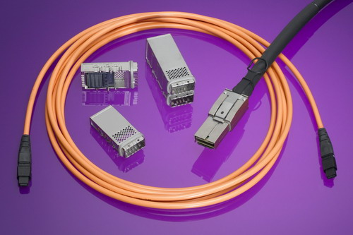 有源光纜組件:CXP 有源光纜(AOC)組件和可插拔收發(fā)器模塊采用了12個(gè)發(fā)射(TX) 和 12 個(gè)接收 (RX)通道,在多模光纖上提供每通道10 Gbps的數(shù)據(jù)速率,傳輸距離長(zhǎng)達(dá)1km (3280.840’)。光纜終端的光電轉(zhuǎn)換由包含了專門(mén)針對(duì)低功耗和高可靠性而優(yōu)化的光引擎的集成式收發(fā)器模塊來(lái)完成。