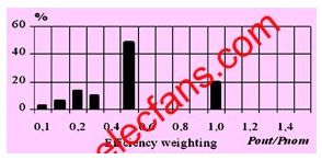 對于傳統(tǒng)電力電子裝置的設(shè)計,我們通常是通過每千瓦多少錢來衡量其性價比的。但是對于光伏逆變器的設(shè)計而言,對最大功率的追求僅僅是處于第二位的,歐洲效率的最大化才是最重要的。因為對于光伏逆變器而言,不僅最大輸出功率的增加可以轉(zhuǎn)化為經(jīng)濟效益,歐洲效率的提高同樣可以,而且更加明顯。歐洲效率的定義不同于我們通常所說的平均效率或者最高效率。它充分考慮了太陽光強度的變化,更加準(zhǔn)確地描述了光伏逆變器的性能。歐洲效率是由不同負載情況下的效率按照不同比重累加得到的,其中半載的效率占其最大組成部分(見圖1)。