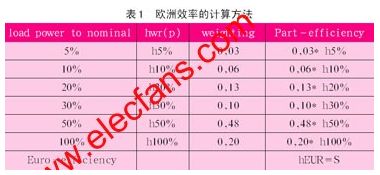 因此為了提高光伏逆變器的歐洲效率,僅僅降低額定負載時的損耗是不夠的,必須同時提高不同負載情況下的效率。歐洲效率是一個新的參數(shù),主要是針對光伏逆變器提出來的。由于太陽光在不同時間,強度是不一樣的,所以光伏逆變器其實并不會一直工作在額定功率下,更多的是工作在輕負載的時候。所以衡量光伏逆變器的效率,不能完全以額定功率下的效率來衡量。所以歐洲人就想出來了一個新的參數(shù)–歐洲效率來衡量。歐洲效率的計算方法如表1。