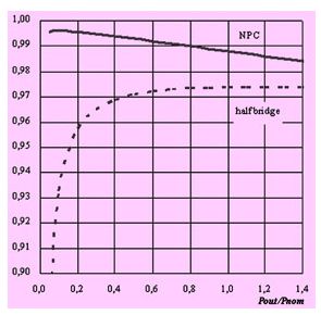 針對1000v直流母線電壓的光伏逆變器,npc拓撲結(jié)構(gòu)逆變器是目前市場上效率最高的。圖12比較了npc模塊(mosfet+igbt)和使用1200v的igbt半橋模塊的效率。