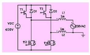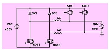由于上橋臂的igbt工作在50hz的開關(guān)頻率下,實際上并不需要對該支路進行濾波。因此對電路拓撲進行優(yōu)化,可以得到圖14所示的發(fā)射極開路型拓撲。這種拓撲的優(yōu)點是只有有高頻電流經(jīng)過的支路才有濾波電感,從而減小了輸出濾波電路的損耗。
