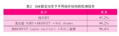 圖16所示拓撲結(jié)構(gòu)允許純無功負載,能夠提高對電網(wǎng)的無功補償,也能滿足雙向功率流動,例如實現(xiàn)高效電池充電。如果應(yīng)用sic肖特基二極管,這種電路拓撲將可以達到更高的效率等級。表2是2kw額定功率下不同拓撲結(jié)構(gòu)的歐洲效率