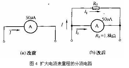 上述的分流電路計(jì)算結(jié)果表明,只要在50uA表頭上并聯(lián)一個(gè)200Ω的電阻,即可使表頭的量程由50uA擴(kuò)大到500uA。