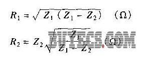 式中,Z1和Z2為網(wǎng)絡(luò)1和網(wǎng)絡(luò)2的阻抗,它們分別為300Ω和75Ω。將它們代入上面兩個(gè)公式中,則求得RI=259.8Ω,R2=86.6Ω。