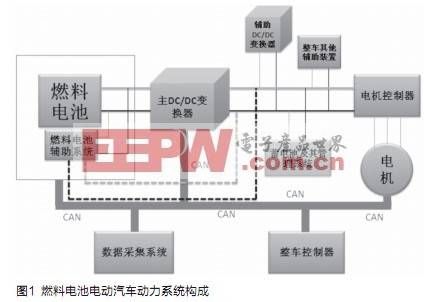 目前,燃料電池電動汽車(FCEV)成為我國汽車科技創(chuàng)新主攻方向。燃料電池電動汽車動力系統(tǒng)主要由燃料電池發(fā)動機,DC/DC變換器,蓄電池,電機控制器(變頻器)及電機,整車控制器,數(shù)據(jù)采集系統(tǒng)及CAN總線組成,如圖1所示。其中DC/DC變換器可以對燃料電池的輸出進(jìn)行控制及能量的傳遞與轉(zhuǎn)換,成為燃料電池電動汽車關(guān)鍵零部件之一。在燃料電池電動汽車運行過程中,DC/DC變換器所處的電磁環(huán)境十分復(fù)雜,各種形式的電磁干擾很多,嚴(yán)重影響了DC/DC變換器的正常運行。因此,研究FCEV用DC/DC變換器的電磁兼容性對DC/DC變換器乃至燃料電池電動汽車的可靠運行具有重要意義。