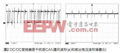 FCEV用DC/DC變換器的功率一般比較大,通常選擇IGBT為功率開關(guān)管。功率開關(guān)管IGBT工作過程中產(chǎn)生高的du/dt和di/dt以及浪涌電流和尖峰電壓[1],這是FCEV用大功率DC/DC變換器產(chǎn)生電磁干擾最根本的原因。另外功率開關(guān)管開通和關(guān)斷瞬間,由于分布電感和分布電容的存在,電感電流容易發(fā)生高頻振蕩,這些因素都會產(chǎn)生強大的電磁干擾,這在FCEV用大功率DC/DC變換器中表現(xiàn)的尤為明顯。這種電磁干擾嚴(yán)重影響整車控制器與CAN通信,導(dǎo)致CAN通訊頻繁報錯,無法正常通訊。CAN通訊受干擾后的傳輸波形如圖2(a)所示。從圖中可以明顯看到,變換器開關(guān)噪音疊加在CAN通訊脈沖上,并且幅度很大。此外,嚴(yán)重的電磁干擾也會使大功率DC/DC變換器輸出紋波過大,紋波過大直接影響大功率DC/DC變換器的性能[2]。圖2(b)是用示波器采集到的變換器未經(jīng)濾波處理的輸出電壓波形,從圖中可以看到,輸出電壓上疊加了大量的開關(guān)噪音。