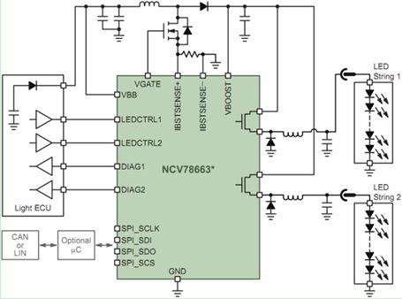 安森美半導體針對LED汽車前照燈系統(tǒng)開發(fā)了NCV78663電源鎮(zhèn)流器及雙LED驅(qū)動器。NCV78663是先進的高可靠性、高能效的系統(tǒng)級芯片(SoC) LED驅(qū)動器,支持達2 A電流,提供高于90%的總能效,驅(qū)動高達60 V電壓的多串LED,能以PWM調(diào)光維持色溫及控制平均電流,使設計人員能夠以一顆高集成度的SoC控制遠光燈及近光燈、日間行車燈、轉(zhuǎn)向指示燈及霧燈,所需外部元件極少。這器件通過SPI接口與外部微控制器通信,在上電后動態(tài)地控制系統(tǒng)參數(shù)、檢測LED工作狀態(tài)并反饋診斷信息。圖4顯示的是NCV78663在先進的汽車前照燈應用中的電路圖。