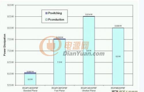 低壓側IGBT同樣有同一問題。究竟哪一種IGBT才能提供最低的功耗?由于這些IGBT只會進行 50Hz或60Hz切換,如圖5所示,標準速度IGBT可提供最低的功耗。雖然標準IGBT會帶來一些開關損耗,但數(shù)值并不足以影響IGBT的總功耗。事實上,最新的槽柵IGBT仍然擁有較高的功耗,因為這一代的槽柵IGBT專門針對高頻率應用而設計,以平衡開關和導通損耗為目標。因此,對低壓側IGBT 來說,標準速度平面式IGBT仍然是必然選擇。