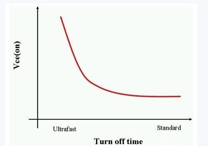 IGBT基本上是具備金屬門氧化物門結構的雙極型晶體管 (BJT) 。這種設計讓IGBT的柵極可以像MOSFET一樣,以電壓代替電流來控制開關。作為一種BJT,IGBT的電流處理能力比MOSFET更高。同時,IGBT亦如BJT一樣是一種少數(shù)載體元件。這意味著 IGBT關閉的速度是由少數(shù)載體復合的速度快慢來決定。此外,IGBT的關閉時間與它的集極-射極飽和電壓 (Vce(on)) 成反比(如圖3所示)。