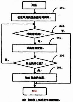亮度感應(yīng)自動控制的自動校正算法的步驟:首先設(shè)定采集亮度數(shù)據(jù)的時間間隔以及設(shè)定采樣次數(shù);當(dāng)時間間隔定時到時,讀取光感應(yīng)器亮度的數(shù)據(jù);當(dāng)采樣次數(shù)到達(dá)預(yù)設(shè)次數(shù)后,輸出穩(wěn)定的亮度;再由CPU輸出穩(wěn)定的PWM,去控制液晶面板的背光。設(shè)定采集亮度數(shù)據(jù)時間間隔201是初始化每次采集光感應(yīng)器亮度的時間。時間定時到202是達(dá)到可以去采集光感應(yīng)器亮度的時間。采集亮度數(shù)據(jù)203是CPU讀取光感應(yīng)器亮度數(shù)據(jù)通過ADC的數(shù)字信號的數(shù)值。到達(dá)采樣次數(shù)204是到達(dá)采集亮度數(shù)據(jù)都一樣的次數(shù),表示環(huán)境亮度已經(jīng)穩(wěn)定,不再變化。輸出穩(wěn)定的亮度205是CPU輸出穩(wěn)定的PWM去控制液晶面板的背光。如圖3亮度感應(yīng)自動控制的自動校正算法的工作流程所示。