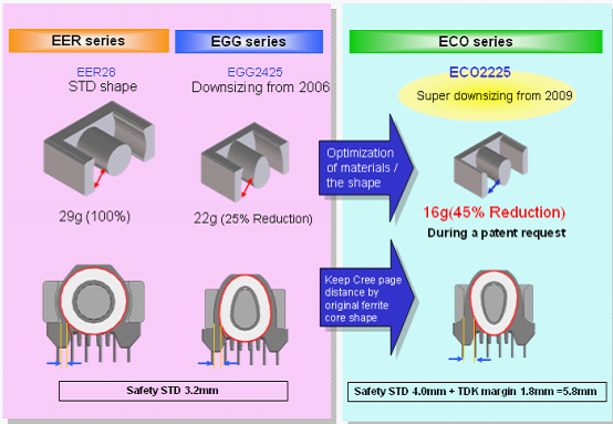 活用高性能材質的優(yōu)點,以EER28市面上最常用的一種變壓器型號分析。由于密度更大,我們可以使變壓器更輕、更小。比如在同樣功率的情況下,用高性能材質體積和重量會比普通材質更小。這邊僅以EER28為例,我們將以ECO2225系列可以取代市場上的EER28,重量有45%的消減。