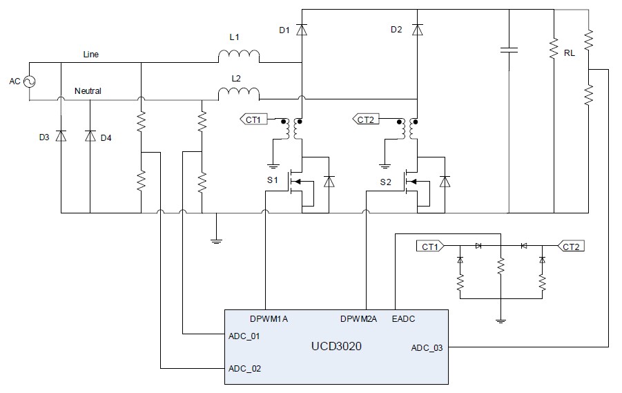 在其他無橋PFC拓?fù)浣Y(jié)構(gòu)中,圖1是一個(gè)已被業(yè)界廣泛采用的無橋PFC實(shí)例。它具有兩個(gè)DC/DC升壓電路,一個(gè)由L1、D1和S1組成,另一個(gè)則由L2、D2和S2組成。D3和D4為慢恢復(fù)二極管。通過參考內(nèi)部電源地,分別檢測(cè)線路(Line)和中性點(diǎn)(Neutral)電壓,測(cè)量得到輸入AC電壓。通過對(duì)比檢測(cè)到的線路和中性點(diǎn)信號(hào),固件便可知道它是一個(gè)正半周,還是一個(gè)負(fù)半周。在一個(gè)正半周內(nèi),第一個(gè)DC/DC升壓電路(L1-S1-D1)有效,并且升壓電流通過二極管D4回到AC中性點(diǎn);在一個(gè)負(fù)半周內(nèi),第二個(gè)DC/DC升壓電路(L2-S2-D2)有效,并且升壓電流二極管通過D3回到AC線。像UCD3020這樣的數(shù)字控制器用于控制這種無橋PFC。