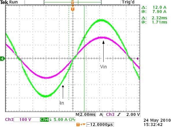 圖5:低壓線路的VIN和IIN波形(VIN=110V,負(fù)載=1100W,THD=2.23%,PF=0.998)