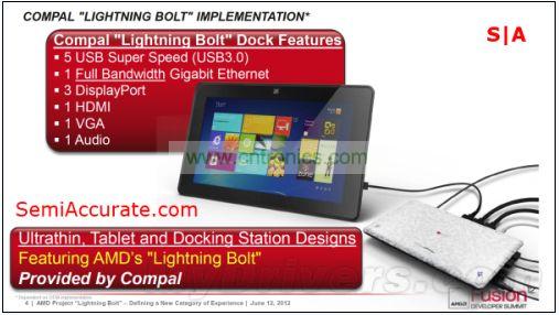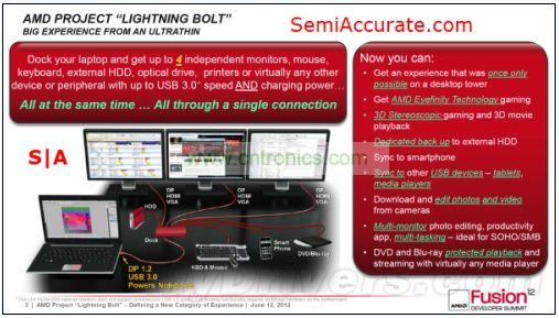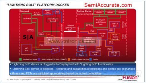 從硬件層面上看,Lightning Bolt其實很簡單,驅(qū)動級的硬件兼容性使得芯片上的USB通道及APU上的DP通道用一條線纜就可以連接起來并輸出到hub上。
