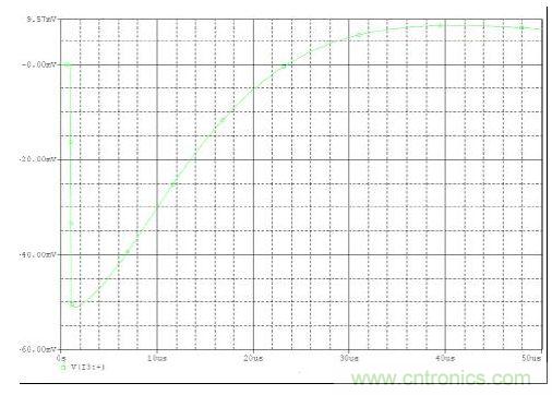 下面是一個如何使用上述關(guān)系的示例。問題是根據(jù)200kHz開關(guān)電源10 amp變化幅度允許范圍內(nèi)的50mV輸出變化挑選一個輸出電容。所允許的峰值輸 出阻抗為:Zout=50 mV / 10 amps 或5毫歐。這就是最大允許輸出電容ESR。接下來就是建立所需的電容。幸運的是,ESR和電容均為正交型,可單獨處理。一 個高 (Aggressive) 電源控制環(huán)路帶寬可以是開關(guān)頻率的1/6或30kHz。于是在 30 kHz 時輸出濾波電容就需要一個不到5毫歐的電抗,或高于1000uF的電容。 圖2顯示了在5毫歐ESR、1000uF電容以及30 kHz電壓模式控制條件時這一問題的負載瞬態(tài)仿真。就校驗這一方法是否有效的10amp負載變動幅度而言, 輸出電壓變化大約為52mV。