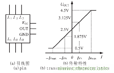 常用的TBC-DS 系列閉環(huán)霍爾電流傳感器的引線框圖和傳輸特性如圖5 所示[6]。圖5(a)所示的霍爾電流傳感器引線中,I+1~3和I-1~3是被測電流的串入繞組引腳, 其中,I+1和I-1是一個(gè)被測電流繞組的引腳,I+2和I-2、I+3和I-3也分別各是一個(gè)被測電流繞組的引腳。當(dāng)3 個(gè)被測電流繞組并聯(lián)時(shí),霍爾電流傳感器的額定測量電流為IPN1; 若將兩個(gè)繞組并聯(lián)再與一個(gè)繞組串聯(lián)時(shí),霍爾電流傳感器的額定測量電流為IPN2;若將3 個(gè)繞組相互串聯(lián)時(shí),霍爾電流傳感器的額定測量電流為IPN3。3 個(gè)額定測量電流間的關(guān)系為:IPN1=2 IPN2=3 IPN3??梢?,通過3 組被測電流繞組的不同接法,可以改變霍爾電流傳感器的額定測量電流值,擴(kuò)展測量區(qū)間。VCC為電源引腳,電源電壓通常為5 V;GND 是電源和傳感器輸出電壓的地;OUT 是傳感器電壓輸出引腳。由5(b)所示的霍爾電流傳感器傳輸特性可見,當(dāng)被測電流為0 時(shí),其輸出電壓UOUT =2.5 V;當(dāng)被測電流不為0 且方向?yàn)閺腎+至I-時(shí),輸出電壓UOUT>2.5 V,當(dāng)被測電流不為0 且方向?yàn)閺腎-至I+時(shí),輸出電壓UOUT<2.5 V。IPN和-IPN是霍爾傳感器的正負(fù)額定電流, 當(dāng)被檢測電流達(dá)到額定電流時(shí),根據(jù)電流方向的不同,輸出電壓UOUT 的值分別為3.125 V 或1.875 V, 即相對于2.5 V 的中心值有±0.625 V的偏移。當(dāng)被檢測電流值絕對值大于IPN 時(shí),霍爾傳感器仍可輸出與被檢測電流成線性關(guān)系的電壓值,直至被檢測電流達(dá)到霍爾傳感器的最大檢測電流IPmax。通常,IPmax>3 IPN。