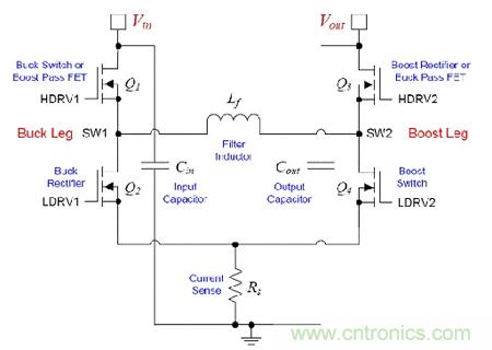 圖1. 4開(kāi)關(guān)同步降壓-升壓轉(zhuǎn)換器功率級(jí)。