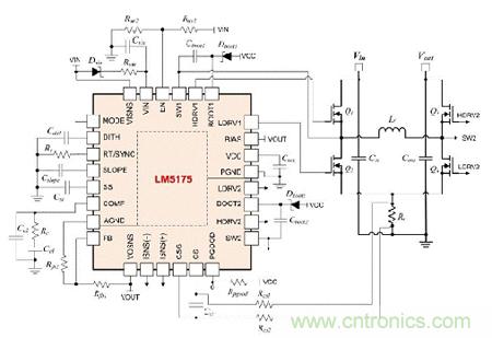 圖2.具有電流模式控制器的4開(kāi)關(guān)降壓-升壓轉(zhuǎn)換器的電路原理圖。