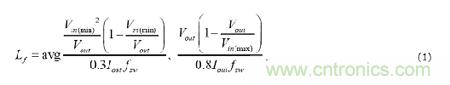 電感取決于輸入電壓范圍和目標(biāo)峰值到峰值電感器紋波電流比。方程式1分別設(shè)定了30%和80%時(shí),深度升壓和深度降壓運(yùn)行點(diǎn)內(nèi)的目標(biāo)紋波電流比。