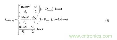 根據(jù)針對(duì)電流限值的相關(guān)閾值設(shè)定分路電阻。例如,方程式2適用于LM5175,并在降壓中指定80mV谷值閾值,在升壓中指定160mV的峰值閾值。當(dāng)升壓占空比在其最大值時(shí),分路功率耗散在最低輸入電壓上達(dá)到峰值。一個(gè)寬縱橫比分路電阻器,比如說(shuō)封裝規(guī)格為1225的電阻器,有利于將PCB布局布線中的元件放置位置[5]靠近兩個(gè)低側(cè)MOSFET的源極連接。
