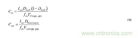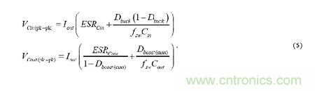在圖4中,步驟4和5是指分別由降壓和升壓工作模式設(shè)定的輸入和輸出電容值。高密度設(shè)計(jì)越來(lái)越多地將數(shù)個(gè)X5R-或X7R-介質(zhì)陶瓷元件組合在一起,有時(shí)還附帶著一個(gè)小尺寸電解電容器來(lái)實(shí)現(xiàn)大批量?jī)?chǔ)能功能。方程式4使用針對(duì)峰值到峰值的紋波電壓,在假定沒(méi)有等效串聯(lián)電阻 (ESR) 紋波分量的情況下設(shè)定基線電容估計(jì)值。