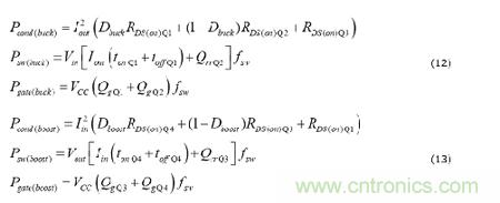 方程式12和13分別計(jì)算降壓和升壓模式下的傳導(dǎo)、開(kāi)關(guān)和柵極驅(qū)動(dòng)損耗。針對(duì)降壓-升壓模式的相應(yīng)表達(dá)式是方程式12和13的權(quán)重組合,其依據(jù)是降壓-升壓窗口中的運(yùn)行點(diǎn),并且將頻率除以2。
