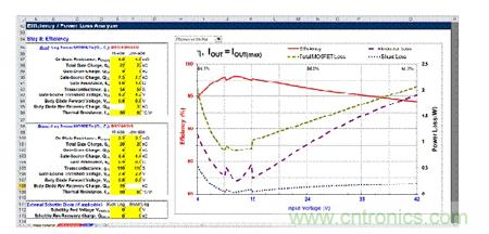 圖5. 步驟8是指MOSFET技術(shù)規(guī)格、效率曲線圖和功率損耗分析。