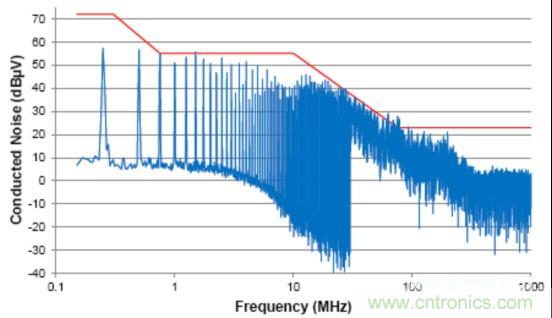 由于信號(hào)的共模部分能夠與系統(tǒng)(或與外部系統(tǒng))中的其它分量耦合在一起(通過(guò)輻射或傳導(dǎo)路徑),這個(gè)共模噪聲直接影響放射性能。這個(gè)器件的傳導(dǎo)放射按照工業(yè)電氣工程/電子 (IBEE) 茨維考技術(shù)的工程服務(wù)進(jìn)行測(cè)量;如圖2中所示,這個(gè)器件的傳導(dǎo)放射連同一個(gè)普通汽車原始設(shè)備制造商(OEM)限值線一同繪制。