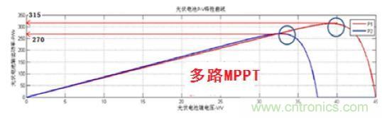 集散式的多路MPPT技術(shù)設(shè)計(jì),精細(xì)到每2個(gè)光伏組串對應(yīng)1個(gè)MPPT跟蹤,在集散式匯流箱再經(jīng)過升壓后穩(wěn)壓輸出,解決了并聯(lián)失配的問題。如下圖4所示,多路MPPT能形成多條MPPT曲線跟蹤,每2個(gè)組串形成一個(gè)MPPT曲線,這樣的精細(xì)化使得每2個(gè)組串都最大效能發(fā)揮作用,解決光伏電站并聯(lián)失配問題,大大提升光伏電站的發(fā)電量,從而大大提升電站的收益。