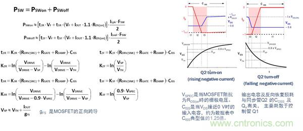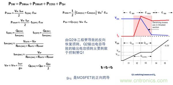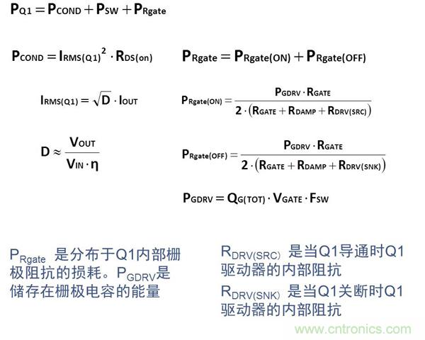 對于高頻應(yīng)用(>MHz),控制管Q1的選用應(yīng)針對降低開關(guān)損耗進(jìn)行優(yōu)化。Q1損耗的計(jì)算公式如下: