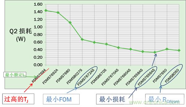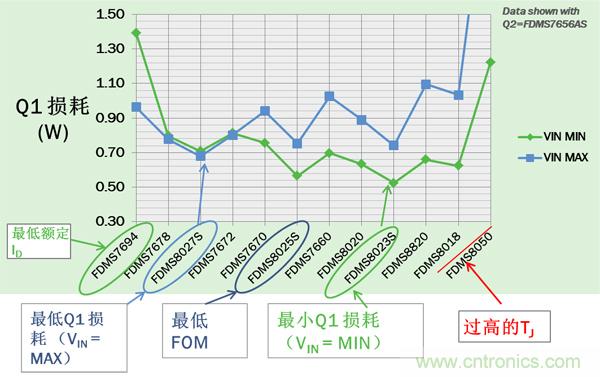 對于Q2,VIN= VINMAX時(shí)損耗最大。圖3所示的12個(gè)器件中,F(xiàn)DMS7656AS有最低的最大損耗。但由于Q2 寄生參數(shù)會(huì)影響Q1的 開關(guān)損耗, 最小Q2 損耗通常并不意味著最佳的總能效。必須比較Q1及Q2的總功耗來找到最佳的Q2以實(shí)現(xiàn)最高能效。