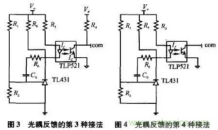 常見(jiàn)的光耦反饋第1種接法,如圖1所示。圖中,Vo為輸出電壓,Vd為芯片的供電電壓。com信號(hào)接芯片的誤差放大器輸出腳,或者把PWM芯片(如UC3525)的內(nèi)部電壓誤差放大器接成同相放大器形式,com信號(hào)則接到其對(duì)應(yīng)的同相端引腳。注意左邊的地為輸出電壓地,右邊的地為芯片供電電壓地,兩者之間用光耦隔離。圖1所示接法的工作原理如下:當(dāng)輸出電壓升高時(shí),TL431的1腳(相當(dāng)于電壓誤差放大器的反向輸入端)電壓上升,3腳(相當(dāng)于電壓誤差放大器的輸出腳)電壓下降,光耦TLP521的原邊電流If增大,光耦的另一端輸出電流Ic增大,電阻R4上的電壓降增大,com引腳電壓下降,占空比減小,輸出電壓減?。环粗?,當(dāng)輸出電壓降低時(shí),調(diào)節(jié)過(guò)程類(lèi)似。開(kāi)關(guān)電源中光耦的作用常見(jiàn)的第2種接法,如圖2所示。與第1種接法不同的是,該接法中光耦的第4腳直接接到芯片的誤差放大器輸出端,而芯片內(nèi)部的電壓誤差放大器必須接成同相端電位高于反相端電位的形式,利用運(yùn)放的一種特性——當(dāng)運(yùn)放輸出電流過(guò)大(超過(guò)運(yùn)放電流輸出能力)時(shí),運(yùn)放的輸出電壓值將下降,輸出電流越大,輸出電壓下降越多。因此,采用這種接法的電路,一定要把PWM芯片的誤差放大器的兩個(gè)輸入引腳接到固定電位上,且必須是同向端電位高于反向端電位,使誤差放大器初始輸出電壓為高。圖2所示接法的工作原理是:當(dāng)輸出電壓升高時(shí),原邊電流If增大,輸出電流Ic增大,由于Ic已經(jīng)超過(guò)了電壓誤差放大器的電流輸出能力,com腳電壓下降,占空比減小,輸出電壓減??;反之,當(dāng)輸出電壓下降時(shí),調(diào)節(jié)過(guò)程類(lèi)似。