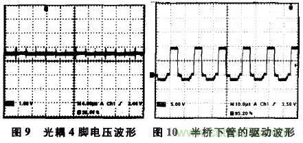 根據(jù)上述分析,以下針對(duì)不同的典型接法,對(duì)比其特性以及適用范圍。本研究以實(shí)際的隔離半橋輔助電源及反激式電源為例說(shuō)明。第1種接法中,接到電壓誤差放大器輸出端的電壓是外部電壓經(jīng)電阻R4降壓之后得到,不受電壓誤差放大器電流輸出能力影響,光耦的工作點(diǎn)選取可以通過(guò)其外接電阻隨意調(diào)節(jié)。按照前面的分析,令電流If的靜態(tài)工作點(diǎn)值大約為10mA,對(duì)應(yīng)的光耦工作溫度在0~100℃變化,值在20~15mA之間。一般PWM芯片的三角波幅值大小不超過(guò)3V,由此選定電阻R4的大小為670Ω,并同時(shí)確定TL431的3腳電壓的靜態(tài)工作點(diǎn)值為12V,那么可以選定電阻R3的值為560Ω。電阻R1與R2的值容易選取,這里取為27k與4.7k。電阻R5與電容C1為PI補(bǔ)償,這里取為3k與10nF。實(shí)驗(yàn)中,半橋輔助電源輸出負(fù)載為控制板上的各類(lèi)控制芯片,加上多路輸出中各路的死負(fù)載,最后的實(shí)際功率大約為30w。實(shí)際測(cè)得的光耦4腳電壓(此電壓與芯片三角波相比較,從而決定驅(qū)動(dòng)占空比)波形,如圖9所示。對(duì)應(yīng)的驅(qū)動(dòng)信號(hào)波形,如圖10所示。圖10的驅(qū)動(dòng)波形有負(fù)電壓部分,是由于上、下管的驅(qū)動(dòng)繞在一個(gè)驅(qū)動(dòng)磁環(huán)上的緣故??梢钥闯?,驅(qū)動(dòng)信號(hào)的占空比比較大,大約為0.7。