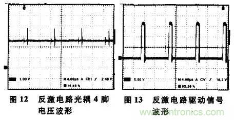 以下是另外一個(gè)實(shí)驗(yàn)反激電路,工作在斷續(xù)模式,實(shí)際測(cè)得其光耦4腳電壓波形,如圖12所示。實(shí)際測(cè)得的驅(qū)動(dòng)信號(hào)波形,如圖13所示,占空比約為0.2。