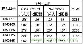 TMG0321/TMG0165/TMG0265/TMG0365芯片是一款高集成度、高性能的PWM+MOSFET管二合一的電流型離線式開(kāi)關(guān)電源控制器。適用于充電器、電源適配器、LED驅(qū)動(dòng)電源等各類(lèi)小功率的開(kāi)關(guān)電源。采用DIP8封裝,無(wú)需加散熱器可輸出0~36W的功率(加散熱可以做到更大)。電路結(jié)構(gòu)簡(jiǎn)單,成本低。具有完善的保護(hù)功能,包括過(guò)壓、欠壓、過(guò)溫、過(guò)載及短路等保護(hù)。固定振蕩頻率及抖頻功能,可以降低EMI。待機(jī)功率低,在待機(jī)時(shí)進(jìn)入跳周期模式,符合“能源之星”等待機(jī)功耗標(biāo)準(zhǔn)要求。