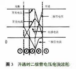 開(kāi)關(guān)管的開(kāi)關(guān)模式電路如圖2所示,二極管可是外接的或MOS管固有的。開(kāi)關(guān)管在開(kāi)通時(shí)的二極管電壓、電流波形如圖3所示。