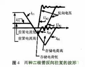 圖4是存儲(chǔ)電荷高或低的兩種二極管電流、電壓波形。從圖中可以看出存儲(chǔ)電荷少時(shí),反向電壓的斜率大,并且會(huì)產(chǎn)生有害的振動(dòng)。而前置電流低則存儲(chǔ)電荷少,即在空載或輕載時(shí)是最壞條件。所以進(jìn)行優(yōu)化驅(qū)動(dòng)電路設(shè)計(jì)時(shí)應(yīng)著重考慮前置電流低的情況,即空載或輕載的情況,應(yīng)使這時(shí)二極管產(chǎn)生的振動(dòng)在可接受范圍內(nèi)。