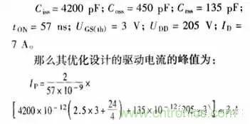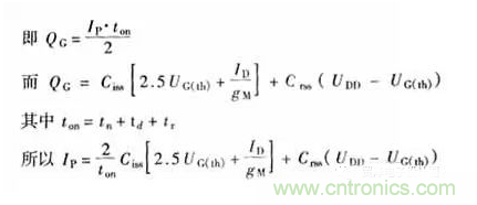 UGS第一段是快速上升到門(mén)限電壓;UGS第二段是比較緩的上升速度以減慢漏極電流的上升速度,但此時(shí)的UGS也必須滿足所需的漏極電流值;UGS第四段快速上升使漏極電壓快速下降;UGS第五段是充電到最后的值。當(dāng)然,要得到完全一樣的驅(qū)動(dòng)波形是很困難的,但是可以得到一個(gè)大概的驅(qū)動(dòng)電流波形,其上升時(shí)間等于理想的漏極電壓下降時(shí)間或漏極電流上升的時(shí)間,并且具有足夠的尖峰值來(lái)充電開(kāi)關(guān)期間的較大等效電容。該柵極尖峰電流IP的計(jì)算是:電荷必須完全滿足開(kāi)關(guān)時(shí)期的寄生電容所需。