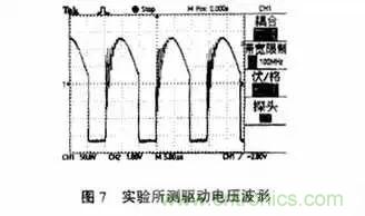 根據(jù)如前所述,驅(qū)動(dòng)電壓、電流的理想波形不應(yīng)該是一條直線,而應(yīng)該是如圖6所示的波形。實(shí)驗(yàn)波形見(jiàn)圖7。