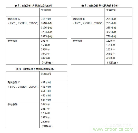 這里,參考條件定義為RHu=75%,Tu=25℃和Vu=1500V。通過(guò)公式(1),可以得到測(cè)試條件A中的加速因子αf_A為5.31k,測(cè)試條件B中的加速因子αf_B為52.0k,測(cè)試條件C中的加速因子αf_B為32.8k。綜合這些加速因子,溫濕反偏試驗(yàn)測(cè)試A、測(cè)試B和測(cè)試C轉(zhuǎn)換為如表1、表2和表3所示的參考條件。
