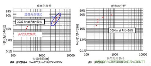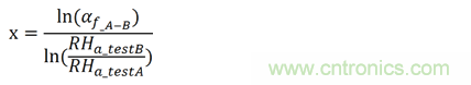 如圖4所示,在測(cè)試條件A的平均壽命為3023個(gè)小時(shí)。同樣,如圖5所示,在測(cè)試條件B的平均壽命為309個(gè)小時(shí)。所以,從相對(duì)濕度85%到相對(duì)濕度95%,加速因子αf_A-B通過(guò)計(jì)算為3023/309=9.78。相對(duì)濕度的經(jīng)驗(yàn)影響因子x通過(guò)下式計(jì)算: