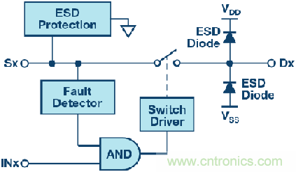 圖2顯示了一個(gè)典型過壓保護(hù)開關(guān)的功能框圖;注意,該開關(guān)的ESD保護(hù)二極管未以其輸入節(jié)點(diǎn)上的電源電壓為基準(zhǔn)。相反,它有一個(gè)ESD保護(hù)單元,在超過器件最大承受電壓時(shí)激活,使器件能承受并阻斷超過其電源電壓的電壓。由于模擬系統(tǒng)通常只要求開關(guān)的外向引腳采用IEC保護(hù),所以,ESD保護(hù)二極管依然保留在內(nèi)向引腳上(標(biāo)志為開關(guān)輸出端或漏極端)。這些二極管能帶來額外的好處,因?yàn)樗鼈兤鸬捷o助保護(hù)器件的作用。在持續(xù)時(shí)間較短、上升時(shí)間快的高壓瞬變(如ESD或EFT)過程中,由于瞬變電壓會(huì)被箝位,所以電壓不會(huì)到達(dá)下游電路。在持續(xù)時(shí)間較長(zhǎng)、上升時(shí)間慢的高壓瞬變(如浪涌)過程中,在開關(guān)過壓保護(hù)功能被激活、開關(guān)斷開、使故障完全與下游電路分離之前,內(nèi)部保護(hù)二極管會(huì)箝位開關(guān)的輸出電壓。