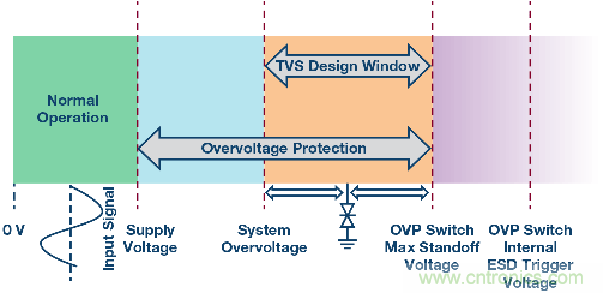 圖3顯示了一個(gè)與外部接口的系統(tǒng)輸入端的工作區(qū)域。最左邊的區(qū)域(綠色)表示正常工作區(qū)間,輸入電壓位于電源電壓范圍以內(nèi)。左起第二個(gè)區(qū)域(藍(lán)色)表示輸入端可能存在持續(xù)直流或長(zhǎng)時(shí)間交流過壓的范圍,原因是斷電、接線錯(cuò)誤或短路。另外,圖中最右側(cè)(紫色)是過壓開關(guān)內(nèi)部ESD保護(hù)二極管的觸發(fā)電壓。選擇的TVS擊穿電壓(橙色)必須小于過壓保護(hù)開關(guān)的最大承受電壓并且大于任何已知的可能持續(xù)直流或長(zhǎng)時(shí)間交流過壓,以免無意中觸發(fā)TVS。