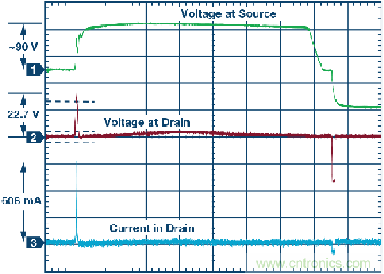 圖6. 8 kV事件期間的漏極電壓和漏極輸出電流。