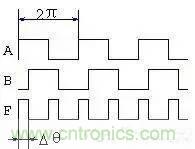 從表1可知,如果輸入端A和B分別送入占空比為50%的信號波形, 則當(dāng)兩者存在相位差Dθ時(shí),輸出端F的波形的占空比與Δθ有關(guān),見圖3。將F輸出波形通過積分器平滑,則積分器輸出波形的平均值,它同樣與Δθ有關(guān),這樣,我們就可以利用異或門來進(jìn)行相位到電壓的轉(zhuǎn)換,構(gòu)成相位檢出電路。于是經(jīng)積分器積分后的平均值(直流分量)為:U = Vdd * Δ θ/π (1)